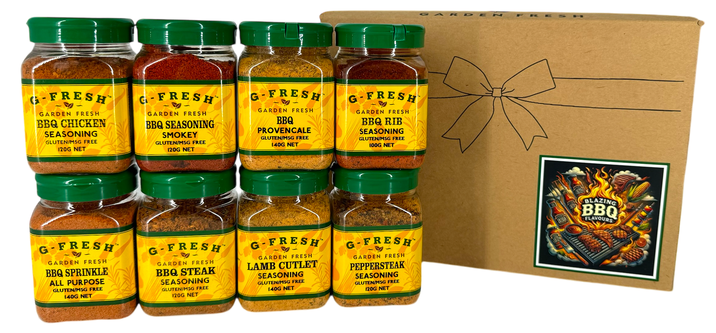 Includes; BBQ Chicken Seasoning, BBQ Provencale, BBQ Rib Seasoning, BBQ Smokey Seasoning, BBQ All Purpose Sprinkle, BBQ Steak Seasoning, Lamb Cutlet Seasoning and Peppersteak Seasoning.